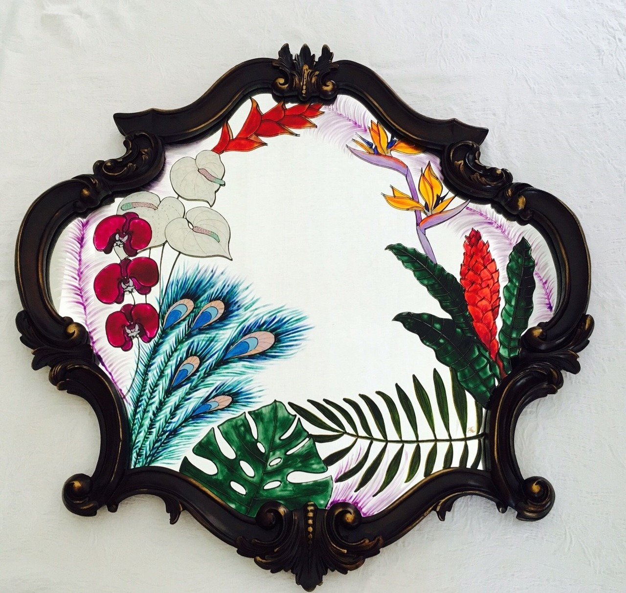 デコラティブなアンティーク風鏡に南国風なデザインを手描きでグラスペイント(ガラス絵付け)しました
