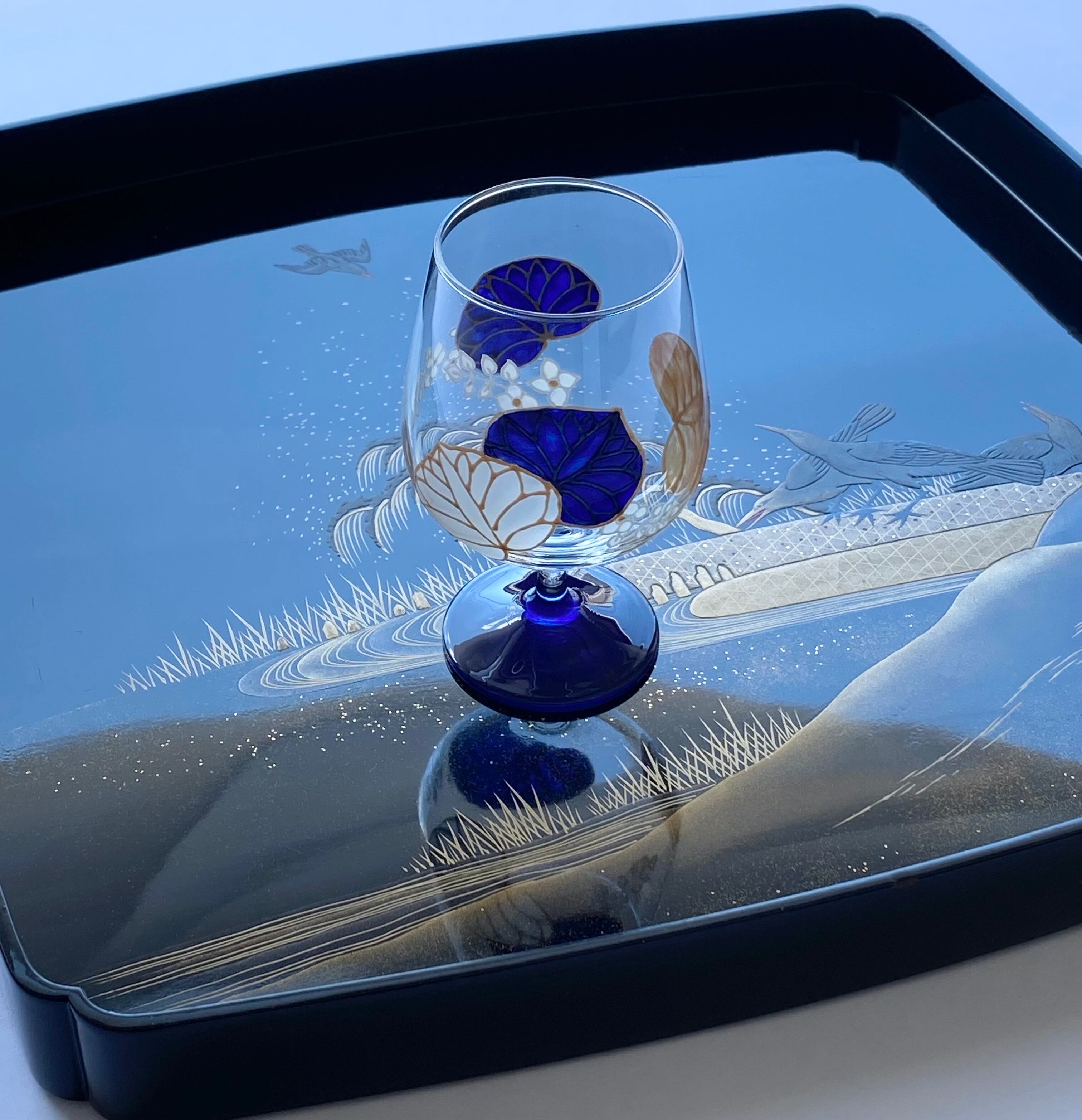 硝子の日本酒グラスお猪口に 南フランスのガラス専用絵具で手描き絵付け。