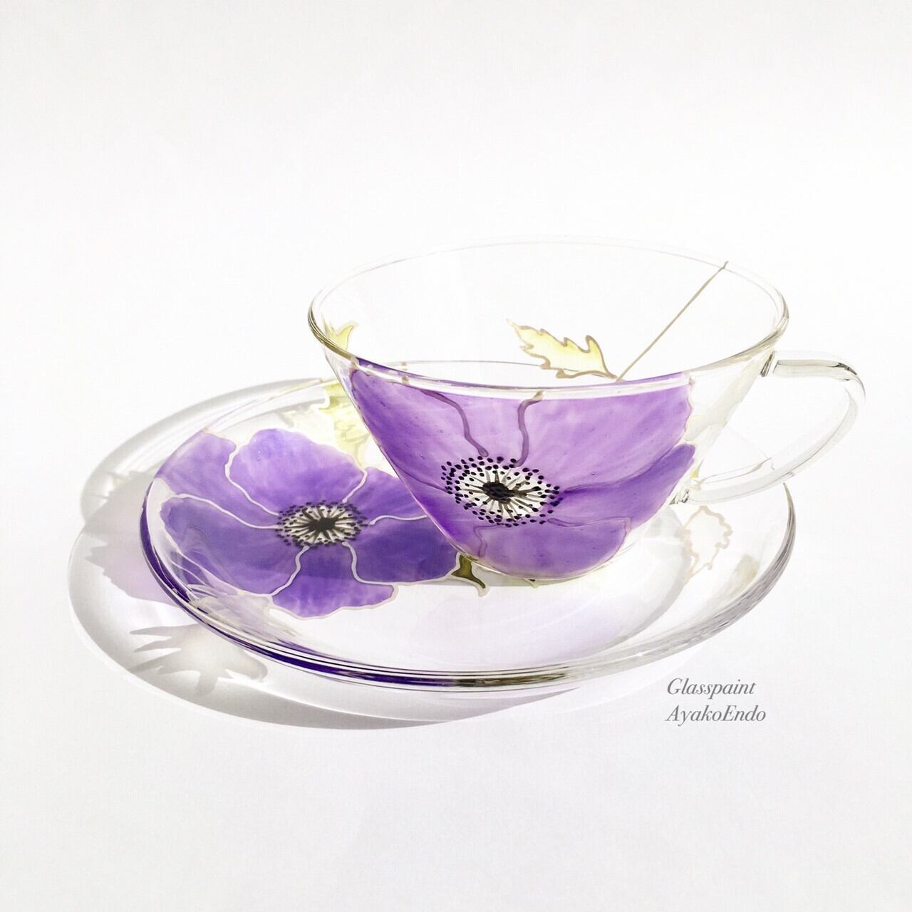 ガラスのカップ&ソーサーに白アネモネを描きました