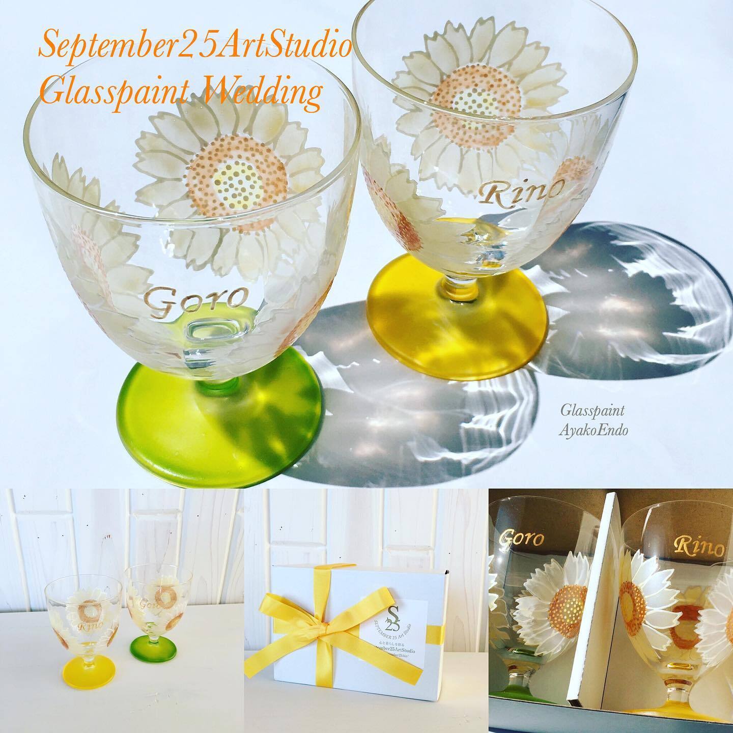 【ひまわりペアグラス】名入りプチワイングラス2つ(手描きガラス絵付け)/結婚祝い・母の日ギフト・誕生日プレゼント・乾杯グラス・結婚式両親への贈呈品・親ギフト